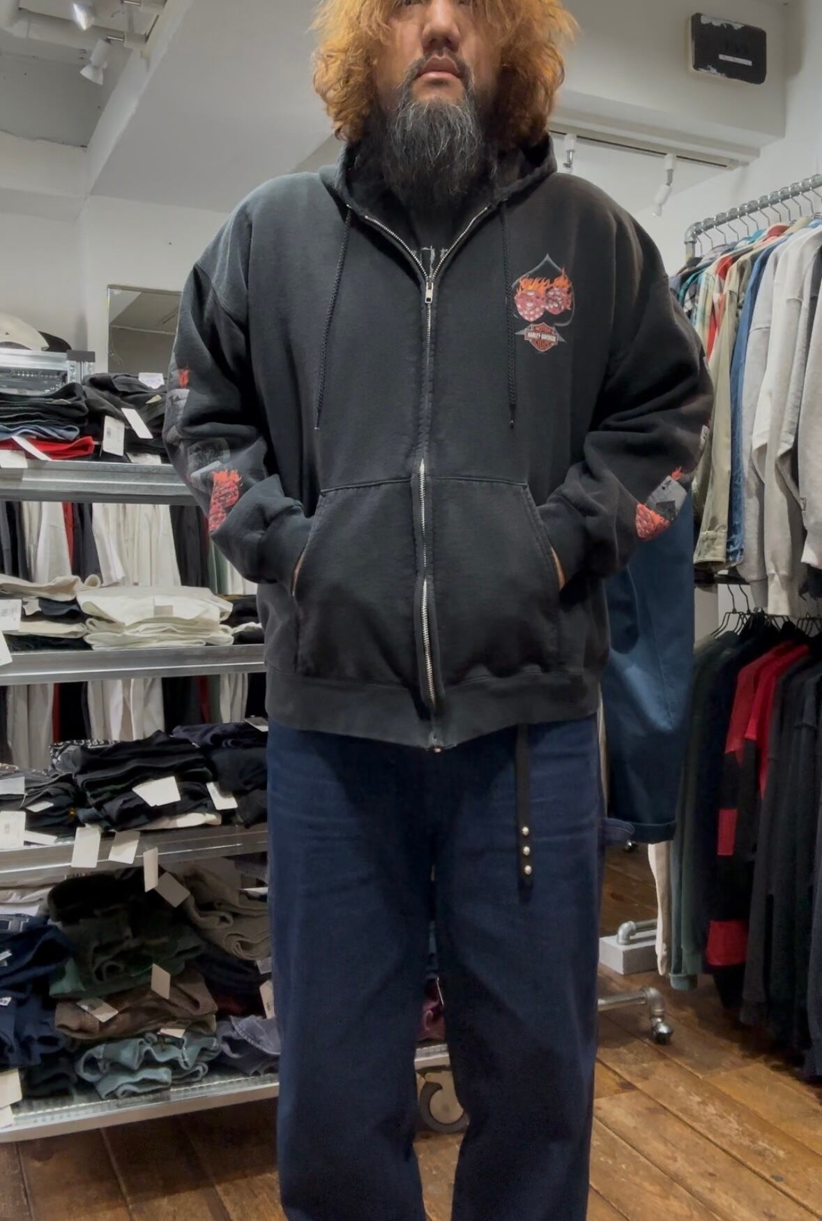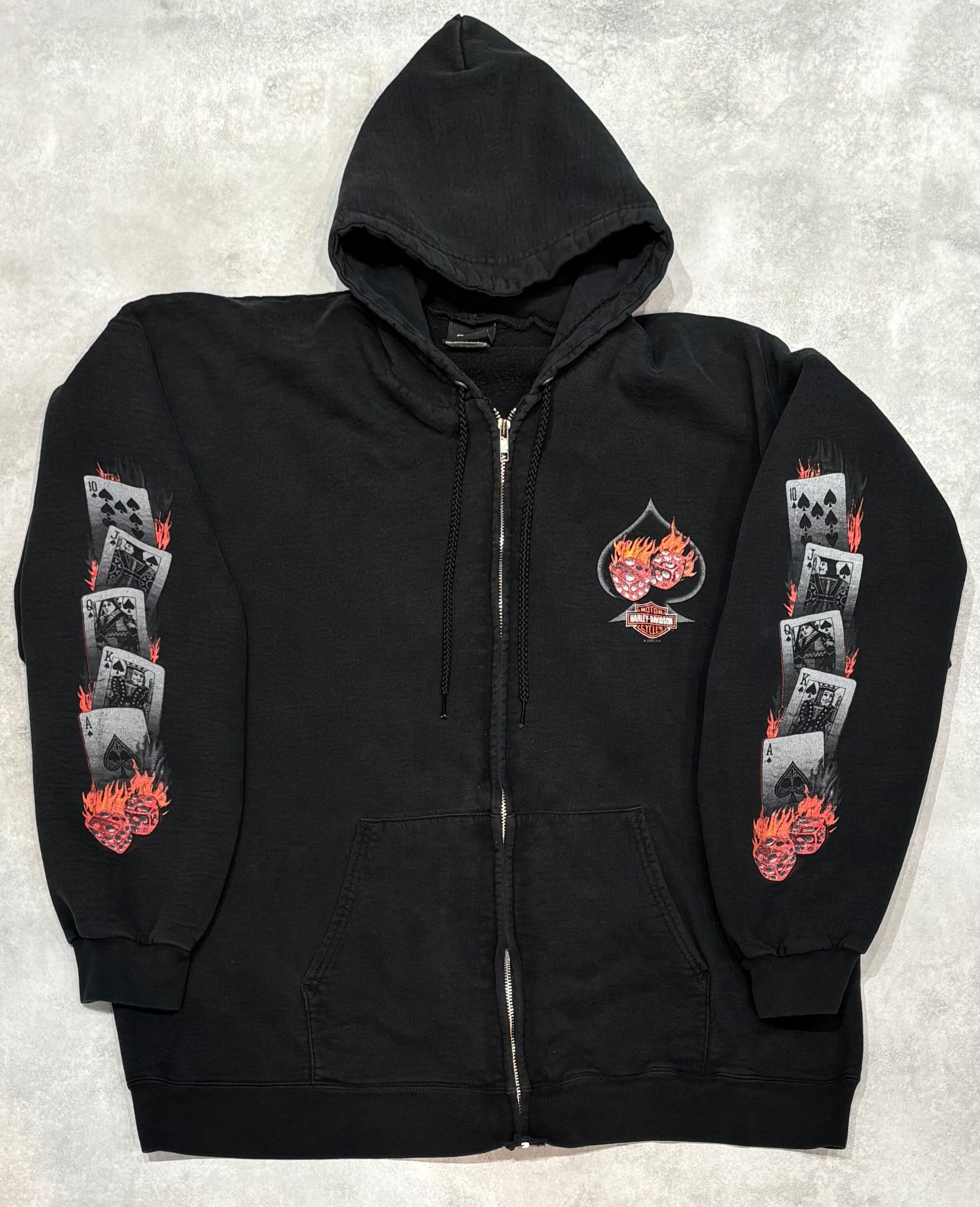 00's Harley-Davidson Zip Hoodie Dice Flame Royal Straight Flush XL ハーレー ジップ パーカー フーディ フレイム ダイス カード