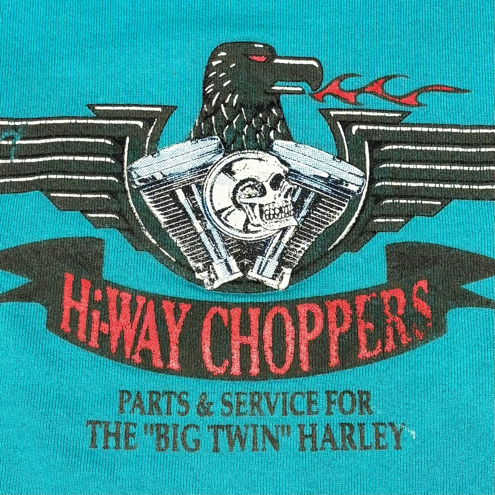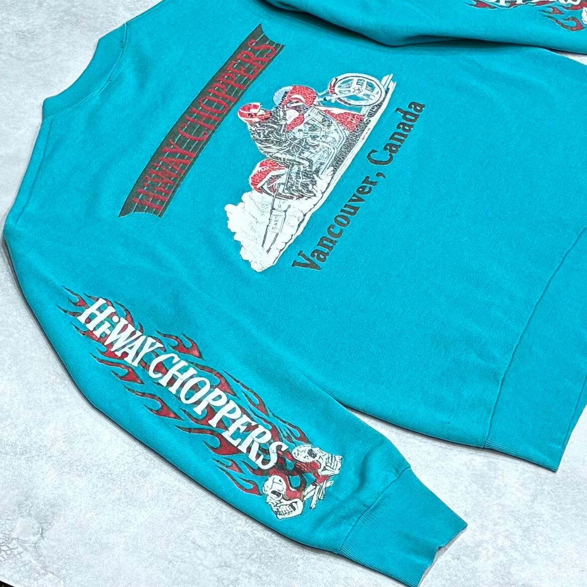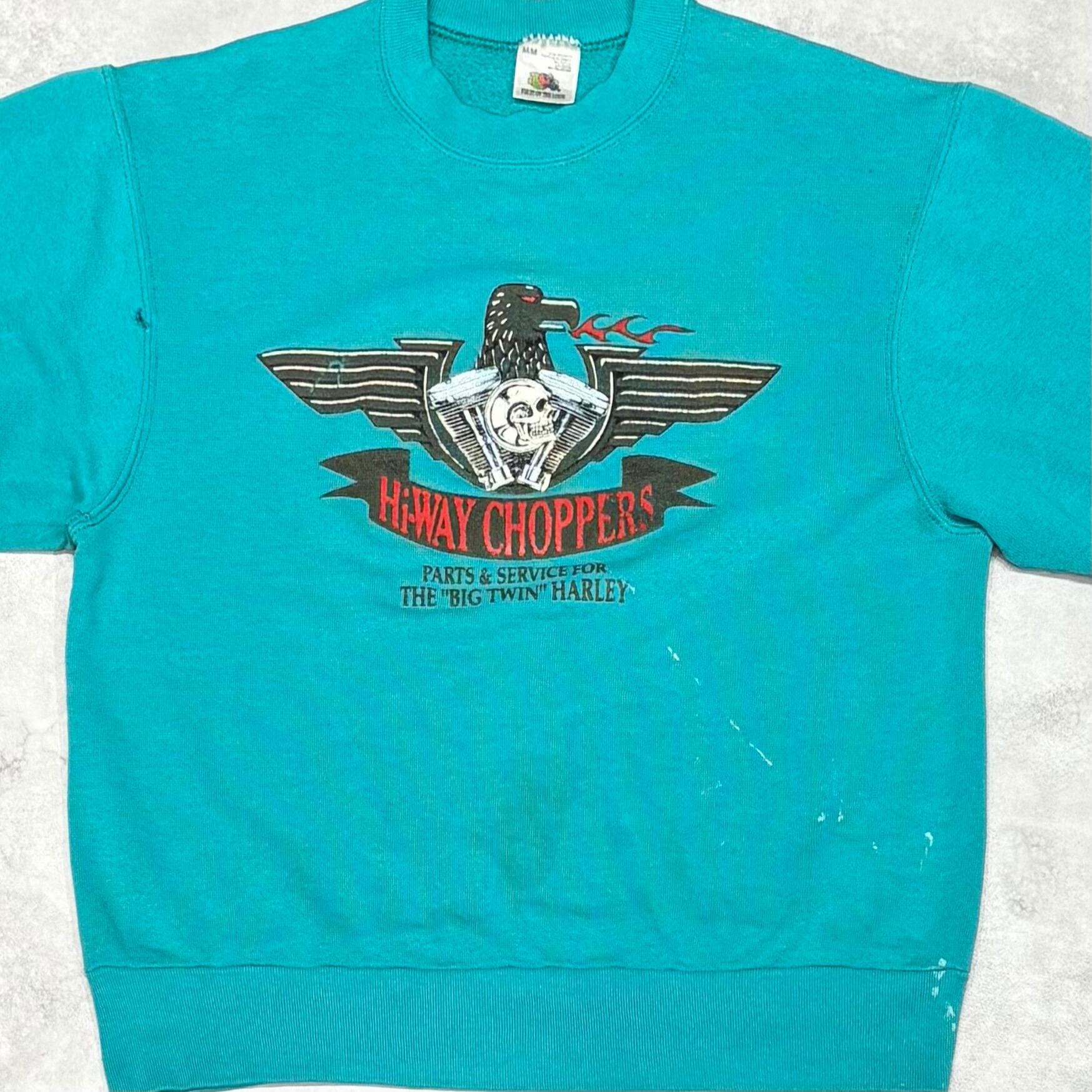 90's Hi-WAY CHOPPERS FRUITS OF THE LOOM Sweatshirts M Tiffany Blue Sleeve Flame Eagle Harley 90年代 チョッパーズ フルーツ スウェット フレイム ティファニー ブルー ハーレー