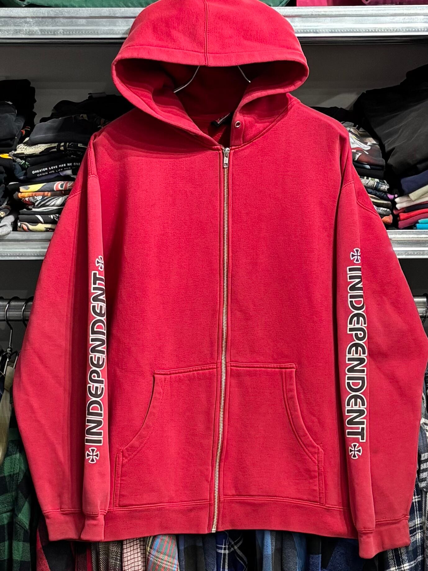 00's independent Zip Hoodie Sweatshirt Good Fade Red L- XL? Old Skateインディペンデント ジップ パーカー フーディー スウェット レッド 赤 フェード 袖プリ