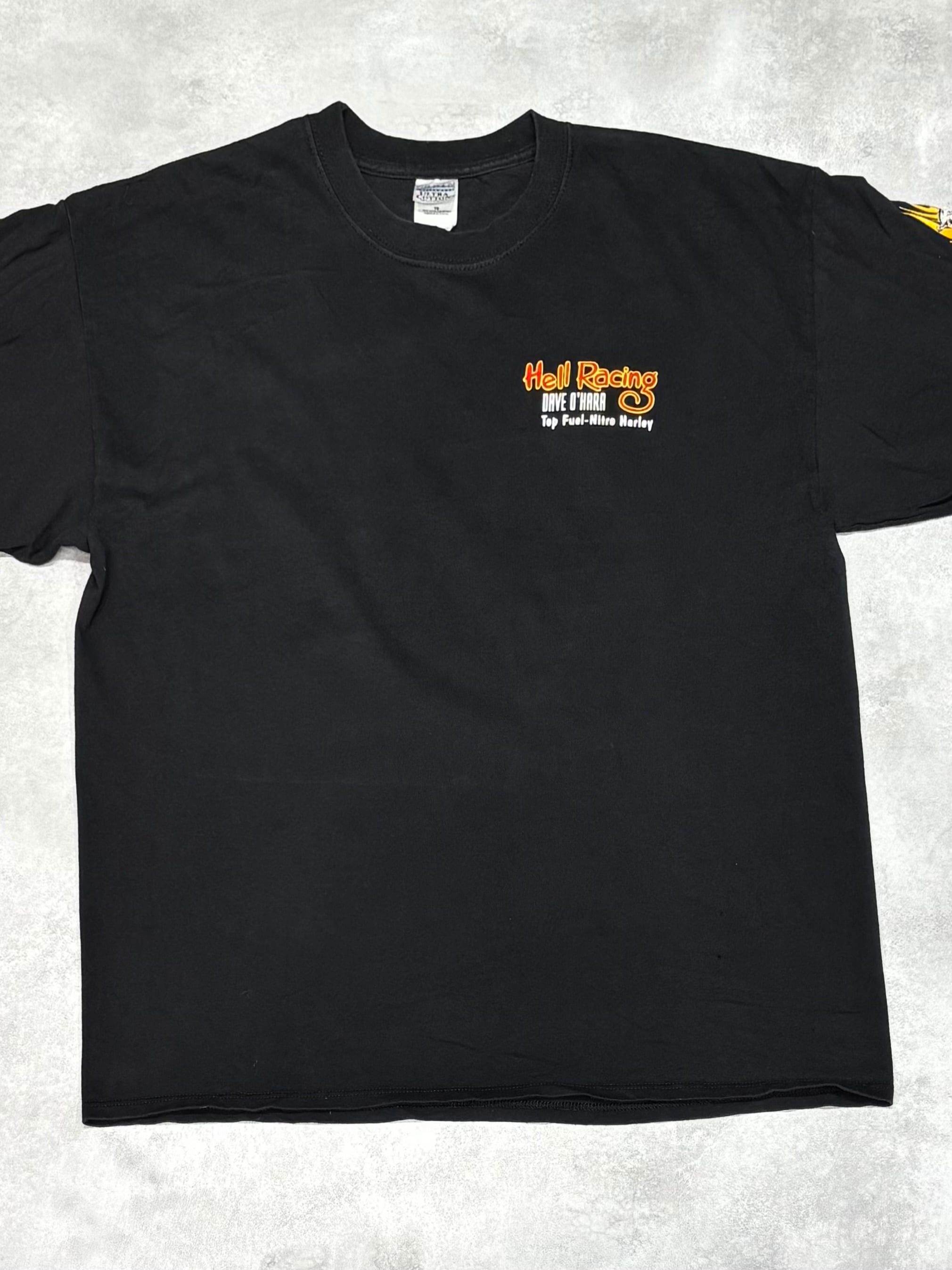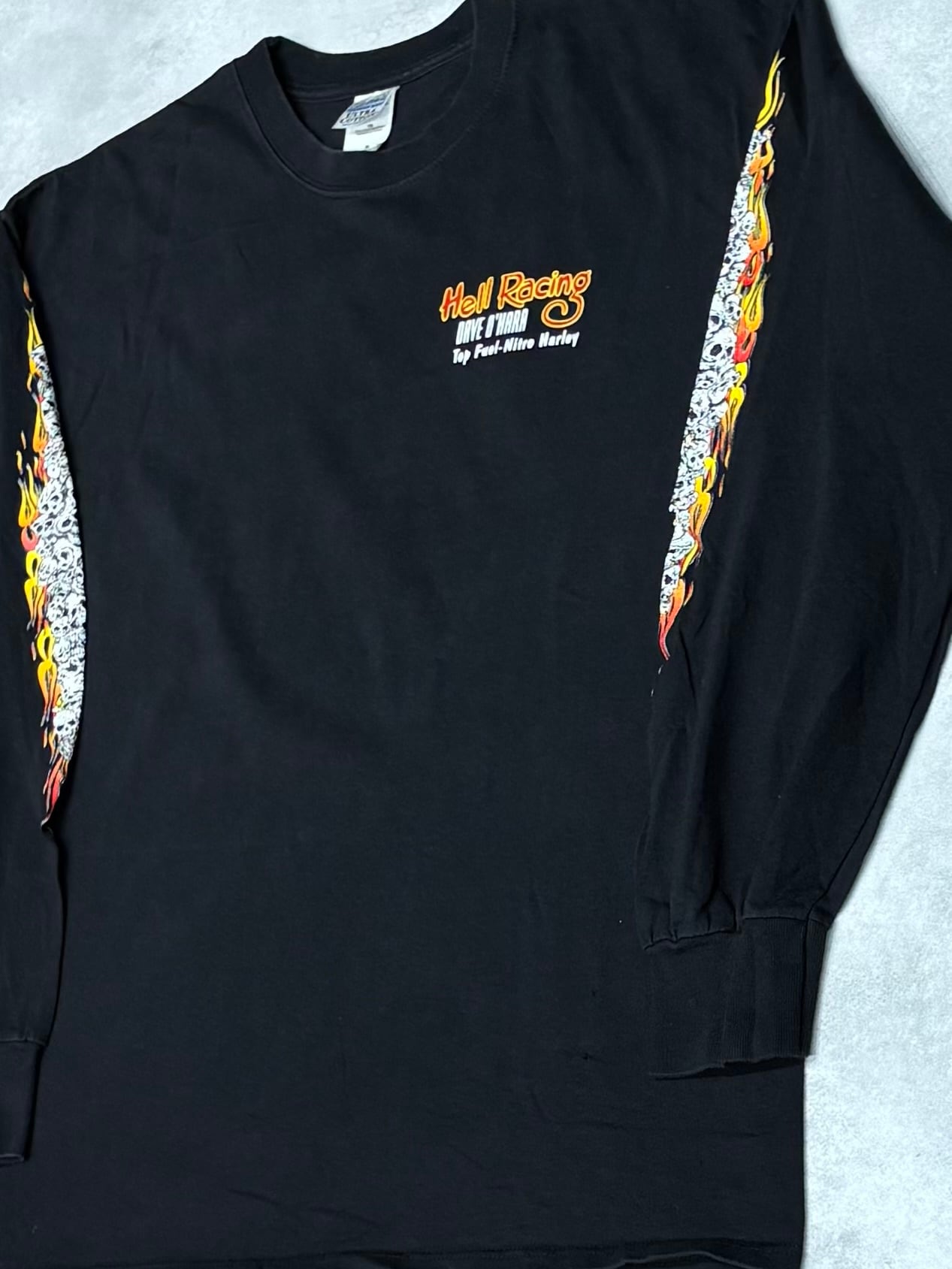 00's GOBIG or FUCK OFF Hell Racing Dave O'Hara Top Fuel-Nitro Harley Flames Skull LS T-Shirt XL Drag racing
