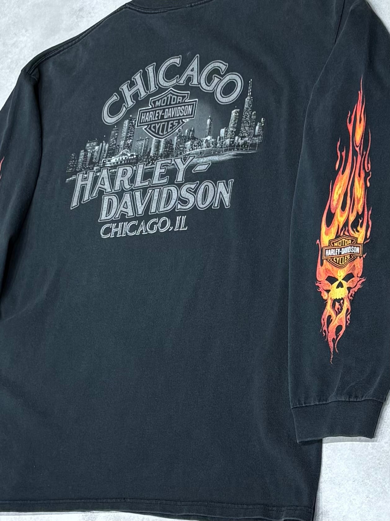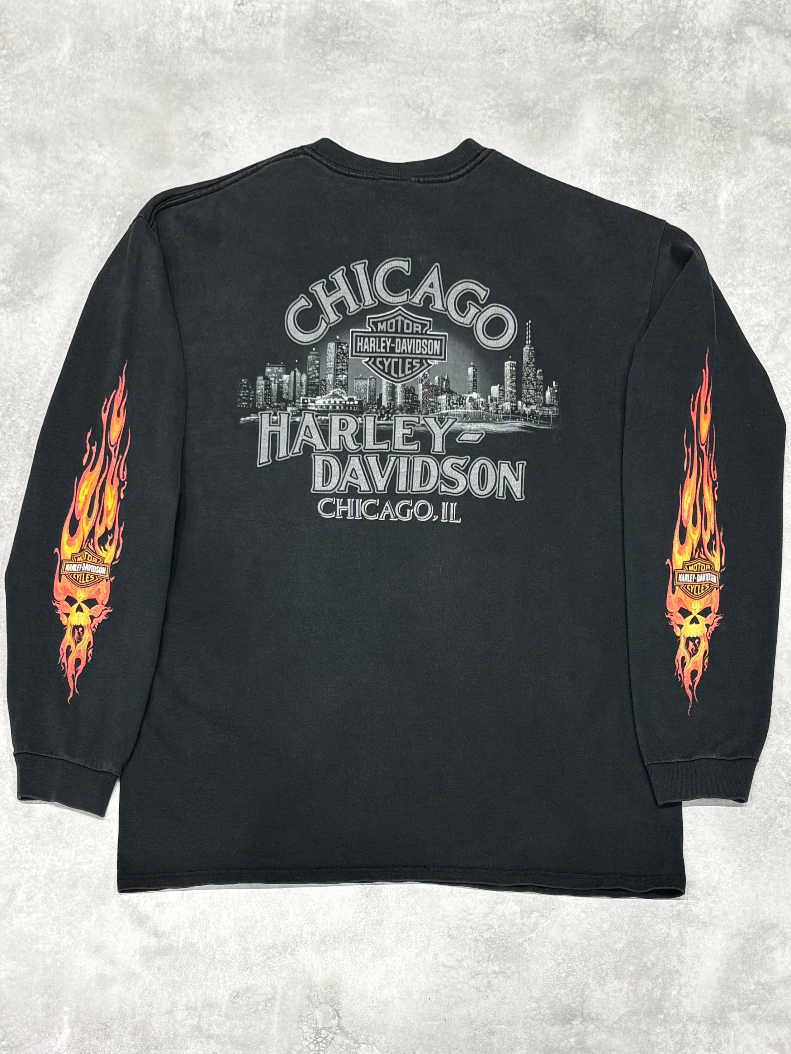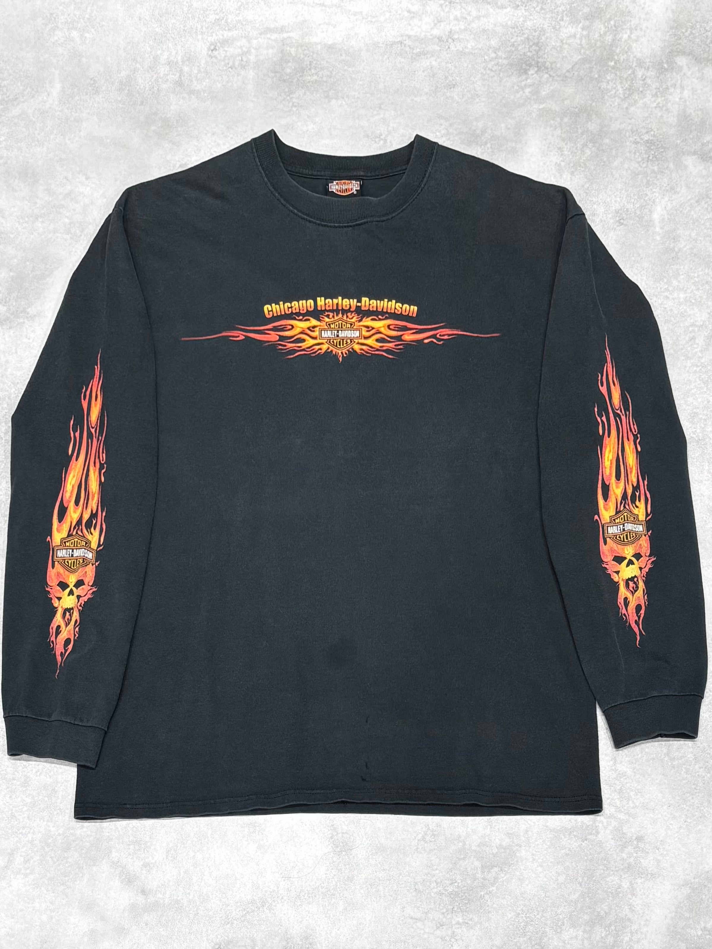 00's Harley-Davidson Skull Flames LS T-Shirt XL Chicago ハーレー スカル フレイム 長袖 ロンT